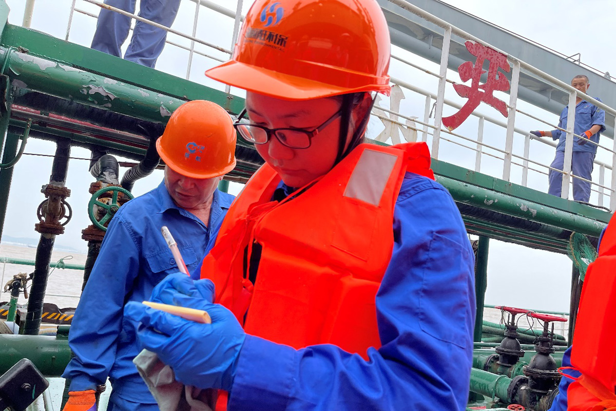 11點30分,慈航9號抵達海靖碼頭1#泊位,在海靖碼頭操作人員熟練的帶纜作業(yè)下,船舶穩(wěn)穩(wěn)的停靠在碼頭上,待架設好懸梯后,化驗班組的員工登船進行油樣采集、量尺作業(yè),隨后接輸油管往油罐抽取油污水。