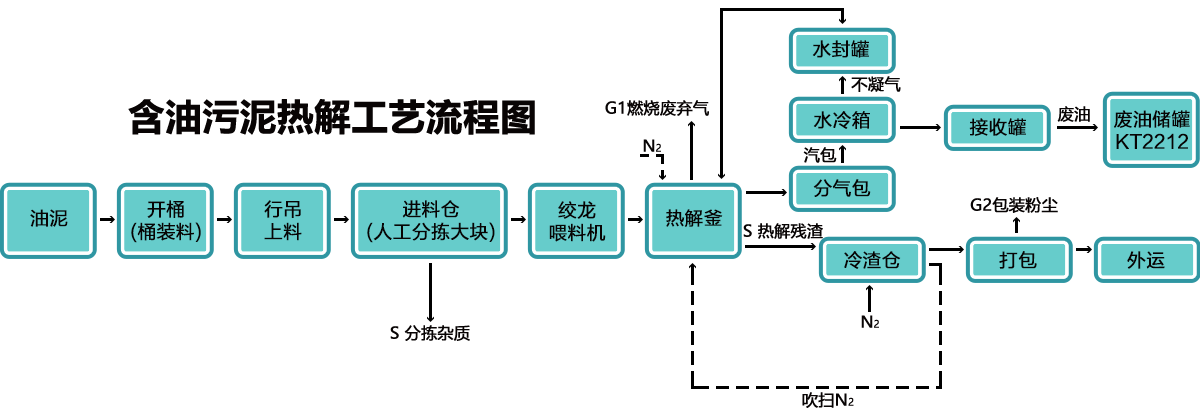 含油污泥資源化利用是通過裂解釜,去除含油污泥中的油污,裂解產(chǎn)生的可燃不凝氣返回加熱爐燃燒作為裂解爐的熱源。凝結(jié)后的裂解油經(jīng)檢驗(yàn)合格后送至罐區(qū)。裂解爐燃燒后的泥渣經(jīng)冷卻,鑒定后再資源化利用。燃燒產(chǎn)生的廢氣通過后續(xù)的除塵脫硫裝置處理后達(dá)標(biāo)排放。